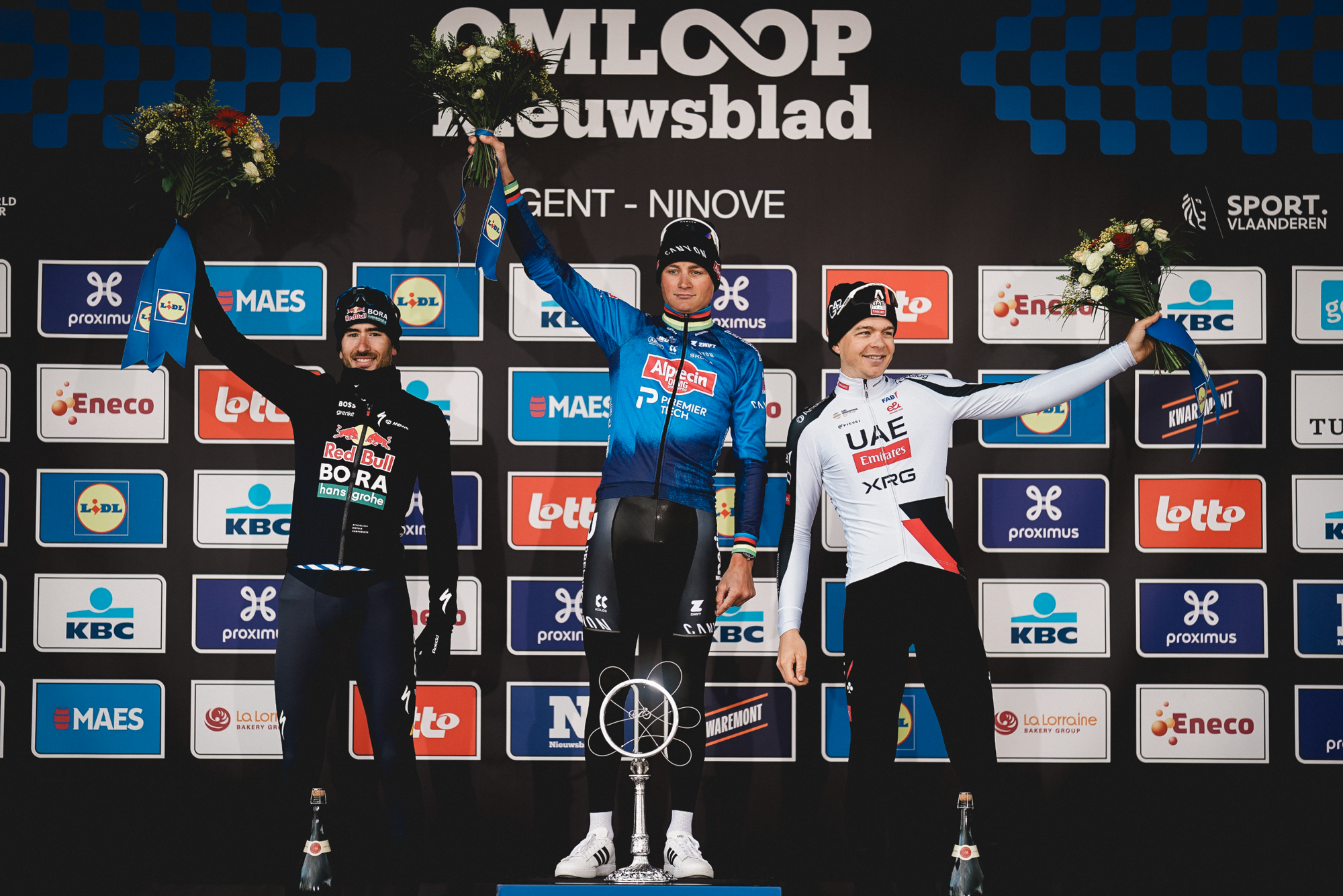 Pour sa première participation au classique d’ouverture, Mathieu van der Poel a frappé fort. Le Néerlandais a placé son attaque sur le Mur de Grammont et s’est envolé en solitaire vers l’arrivée à Ninove. Il ajoute ainsi immédiatement Circuit le Nieuwsblad à son palmarès. Van Dijke et Vermeersch ont accompagné le Néerlandais sur le podium.