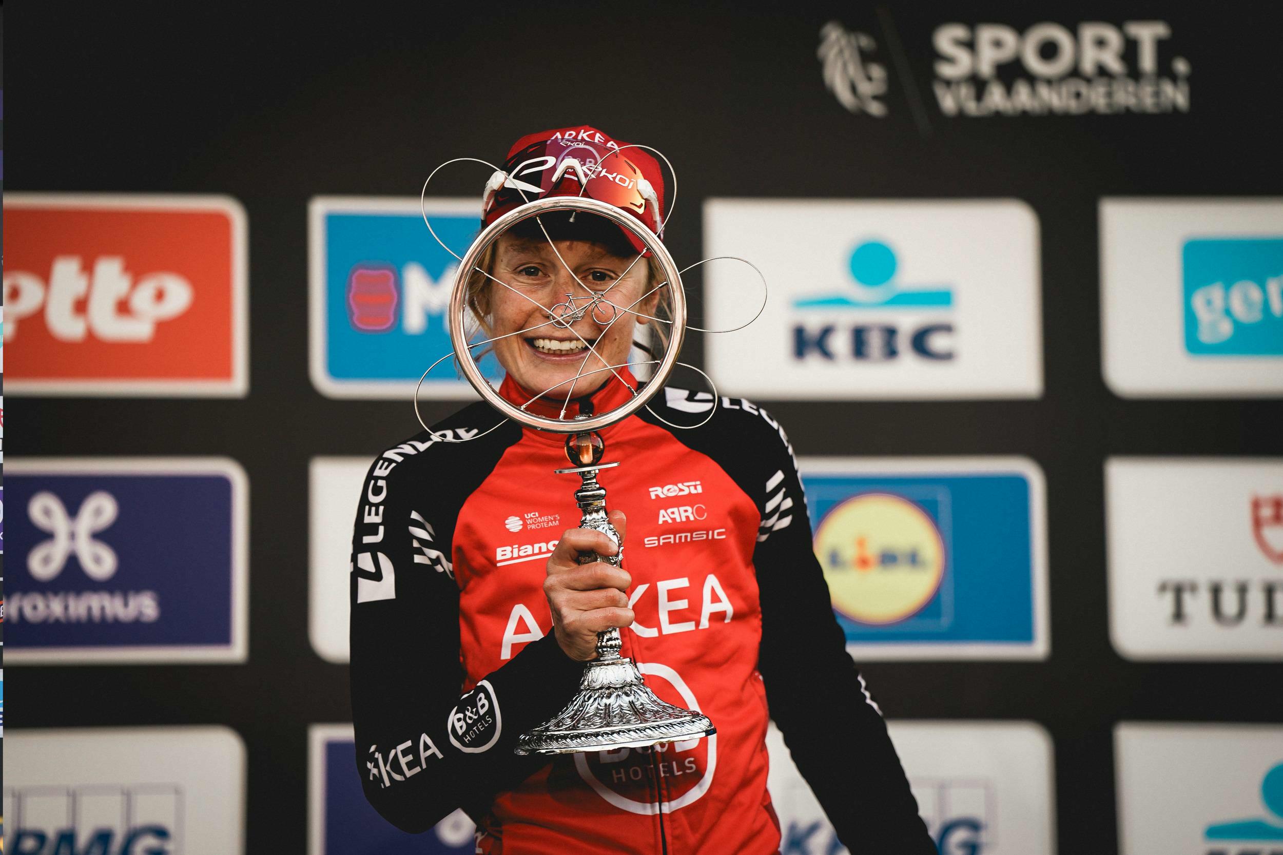 Lotte Claes overleefde samen met Aurela Nerlo de vroege vlucht. De Belgische klopte haar Poolse compane op de streep. Vollering won de sprint om de derde streep van Pieterse.